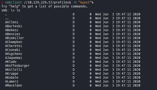 ❯ smbclient //10.129.229.17/profiles$ -U "Guest"%