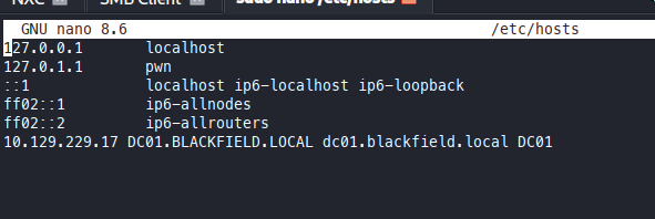 The target machine is DC01 and the domain is Blackfield.local. We need to update our /etc/hosts accordingly.