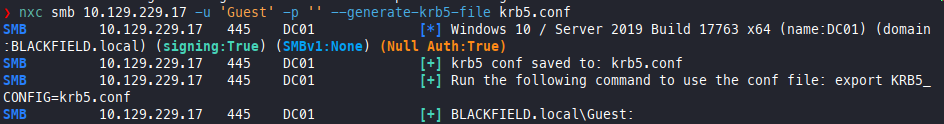 ❯ nxc smb 10.129.229.17 -u 'Guest' -p '' --generate-krb5-file krb5.conf