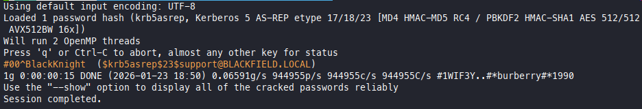 bloodhound-ce-python -c All -d BLACKFIELD.LOCAL -k --zip -u support -p '#00^BlackKnight' -ns 10.129.229.17