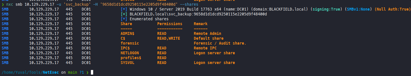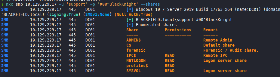 SMB 10.129.229.17 445 DC01 [*] Windows 10 / Server 2019 Build 17763 x64 (name:DC01) (domain:BLACKFIELD.local) (signing:True) (SMBv1:None) (Null Auth:True)