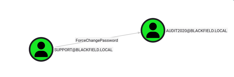 First thing to check is compromised assets. In this case, support@blackfield.local, and we find that this account has ForceChangePassword rights on audit2020@blackfield.local.