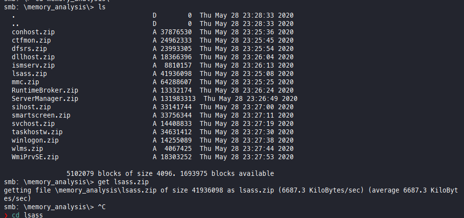 We find an interesting folder memory_analysis and inside it lsass.zip. Since lsass is commonly targeted for credentials, it makes sense to start by taking a look inside.